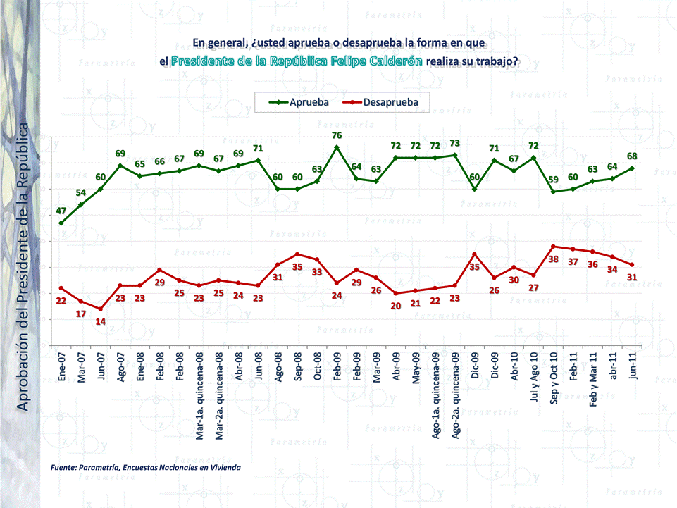 En la serie histórica de Parametría referente al periodo de Calderón, que va desde 2007 hasta junio de 2011 se observa cómo han oscilado los niveles de aprobación en cinco años de gestión. El nivel más alto de aprobación lo encontramos en febrero de 2009 con el 76%.