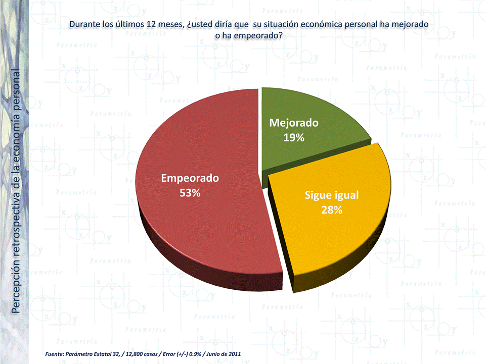 Economía. Es importante considerar la evaluación económica de los mexicanos, en junio de 2011 para el 53% de las personas la situación económica personal en los últimos doce meses había empeorado, el 28% consideró que seguía igual y sólo 19% dijo que había mejorado. Dato que coincide con la mala calificación que se da a la gestión de Calderón en los rubros de generación de empleos y combate a la pobreza (44% y 41% respectivamente)