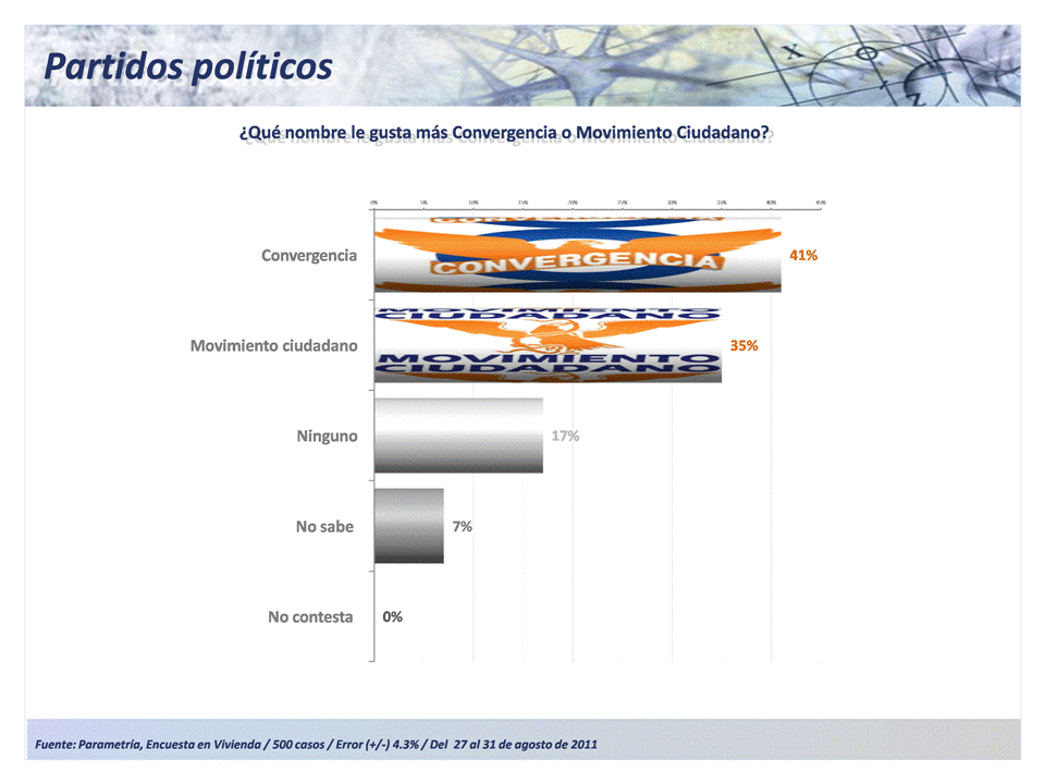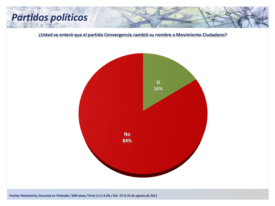 Aunque es probable que la opinión positiva de Movimiento Ciudadano se deba al desconocimiento del mismo como partido político, pues apenas el 16% supo del cambio de nombre de Convergencia. La diferencia en los porcentajes de una y otra denominación se deba tal vez a que el nombre Movimiento Ciudadano no es asociado en automático con un partido político, que, como el resto de los institutos políticos con registro, recibe recursos públicos, tiene prerrogativas y compite por espacios de poder, con una estructura partidista propia.