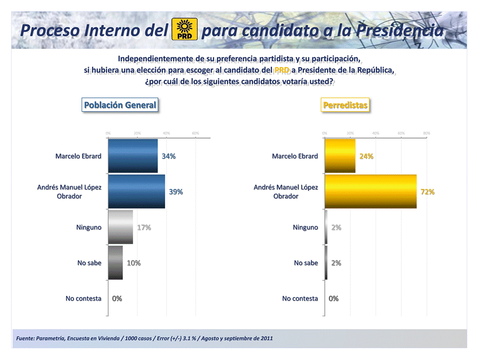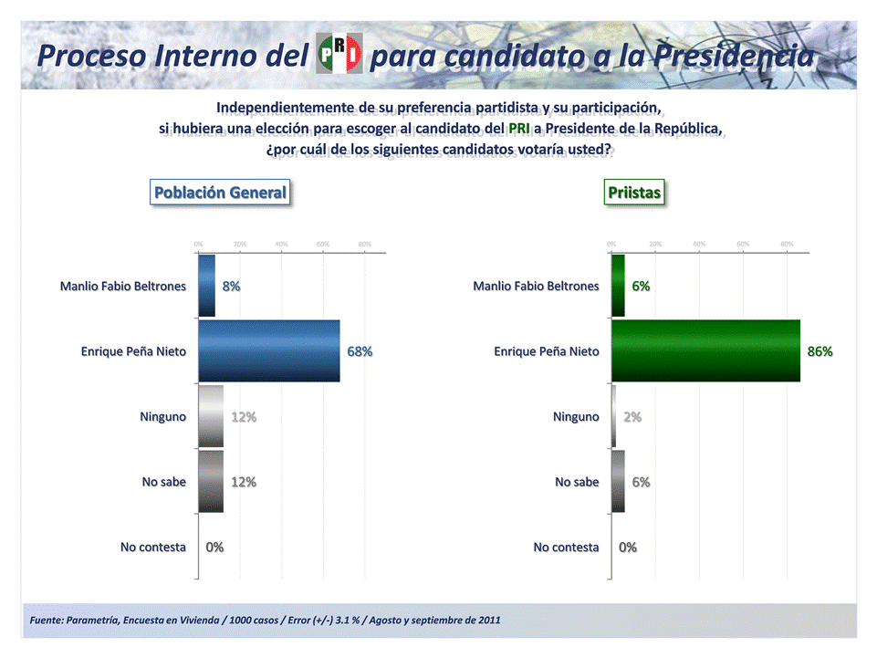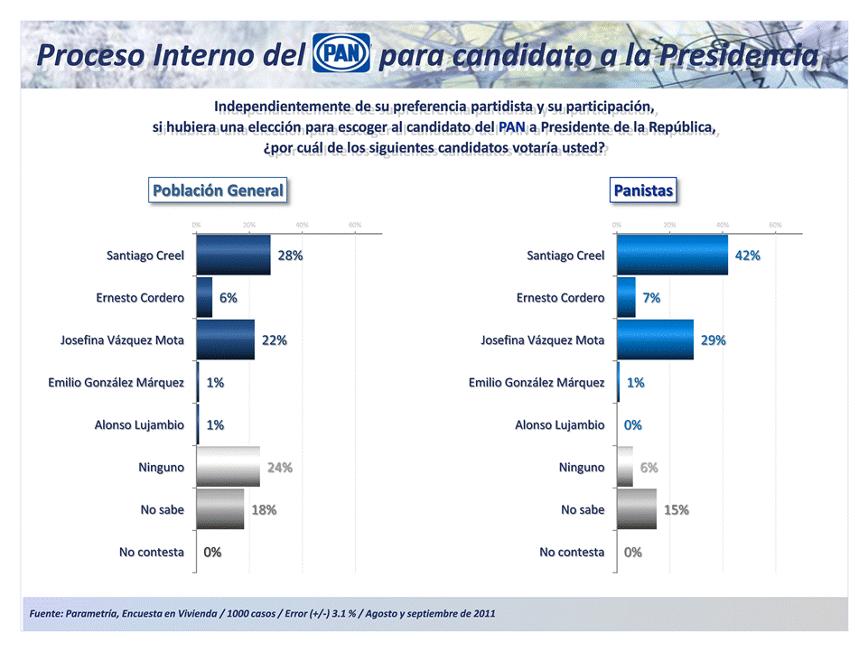 PARAMETRÍA. Estudio: Encuesta Nacional en vivienda. Representatividad: Nacional. Número de entrevistas: 1000 encuestas del 27 al 31 de agosto y del 1 al 5 de octubre de 2011. Nivel de confianza estadística: 95%. Margen de error (+/-) 3.1%. Diseño, muestreo, operativo de campo y análisis: Parametría SA de CV. Método de muestreo: Aleatorio sistemático con probabilidad proporcional al tamaño.Unidad de muestreo: Las secciones electorales reportadas por el IFE.