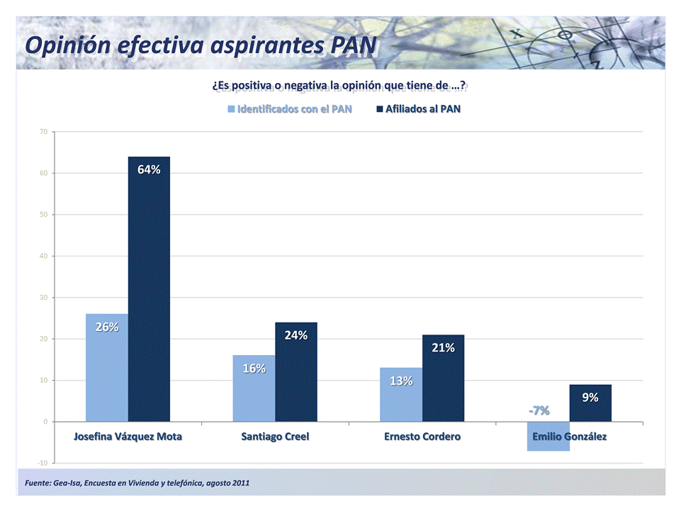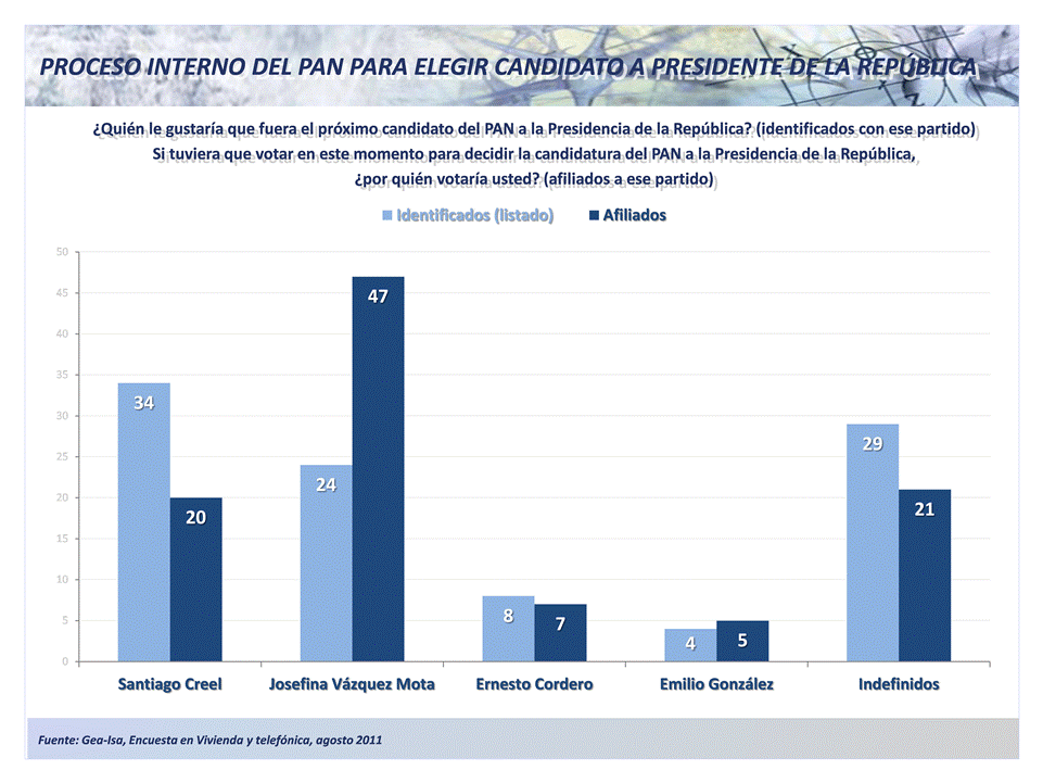 GEA-ISA:Estudio: Escenarios políticos, 2010-2012, gobernabilidad y sucesión. Tercera Encuesta Nacional GEA-ISA 2011. Encuesta Nacional en vivienda y telefónica. Representatividad: Nacional. Número de entrevistas: 1000 encuestas en vivienda del 25 al 28 de agosto de 2011, y 401 entrevistas telefónicas del 27 al 28 de agosto de 2011. Nivel de confianza estadística: 95%. Margen de error (+/-) 4% en vivienda y (+/-) 5% en telefónica.