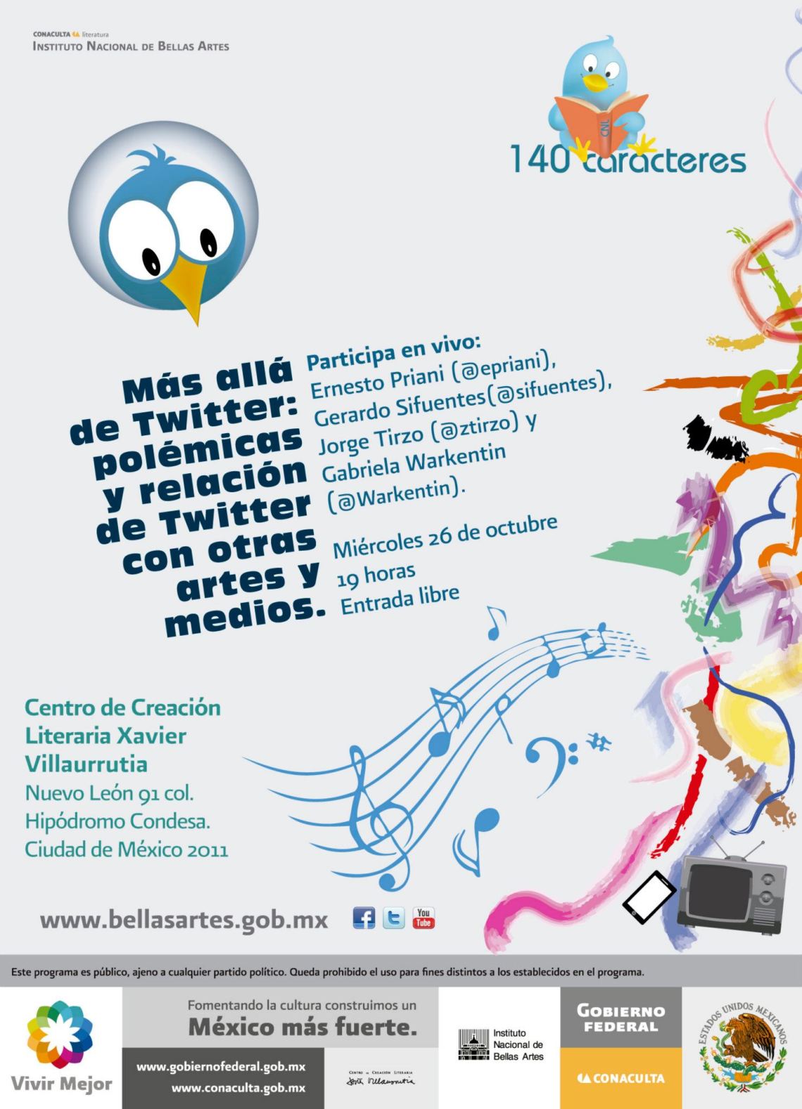 El miércoles 26 de octubre de 2011 participaré en el ciclo «140 caracteres» que organiza el Instituto Nacional de Bellas Artes mediante su Coordinación de Literatura.