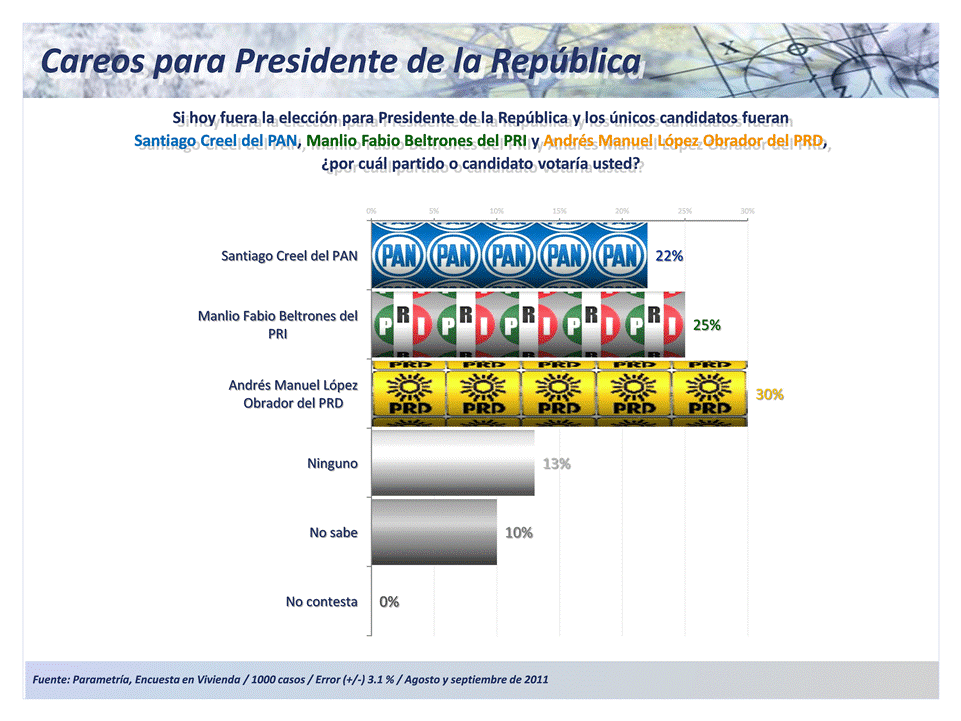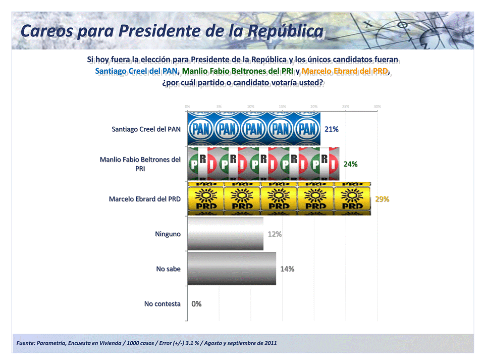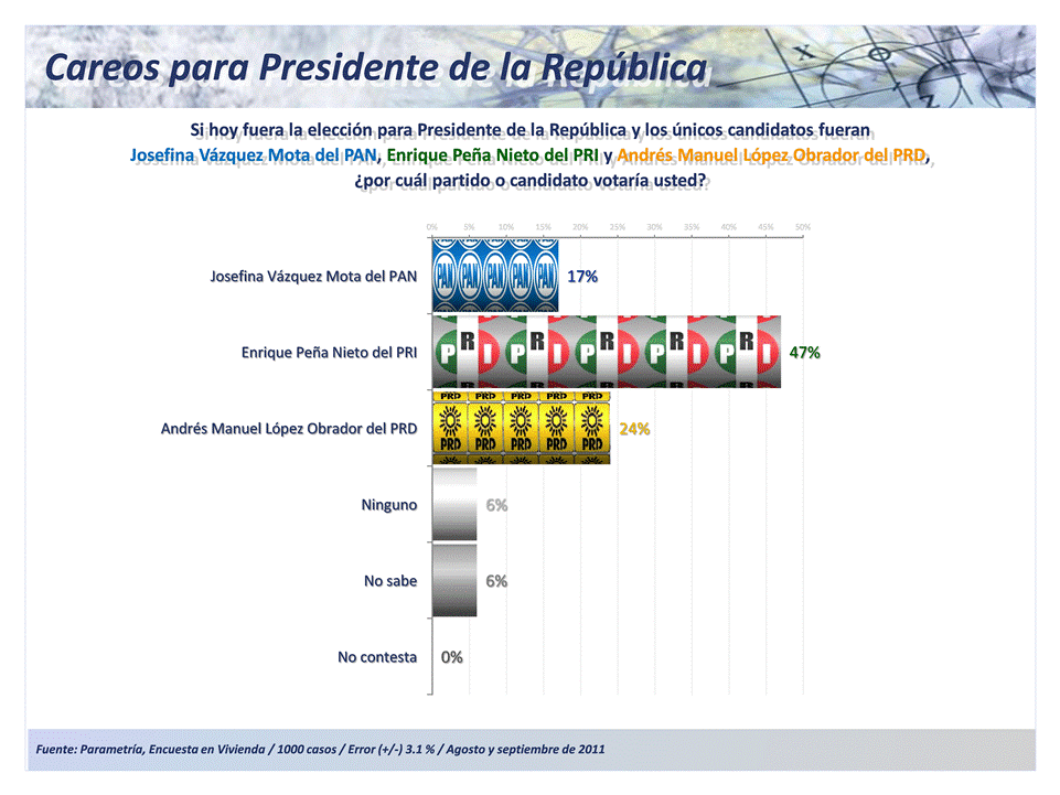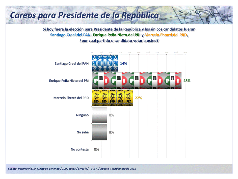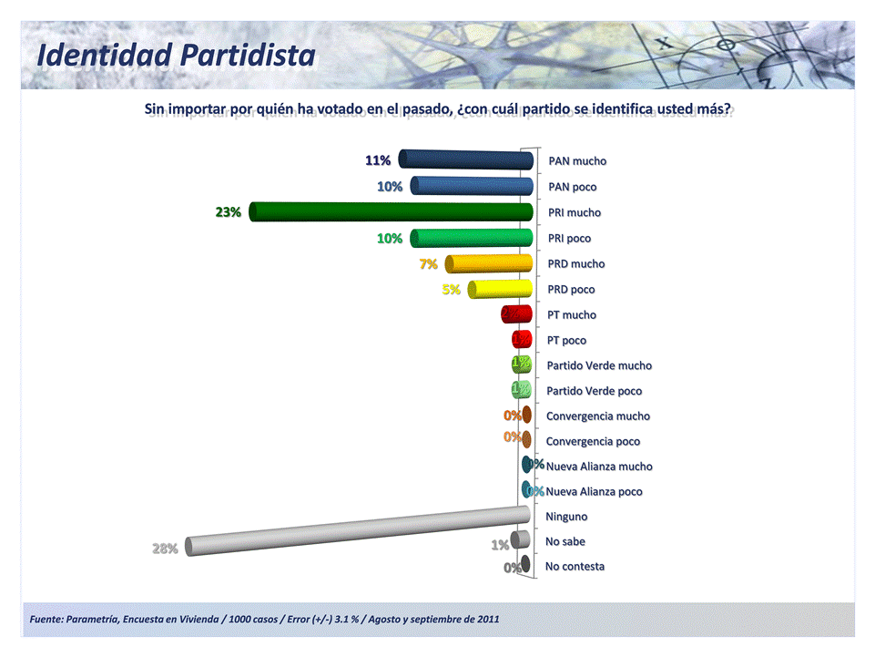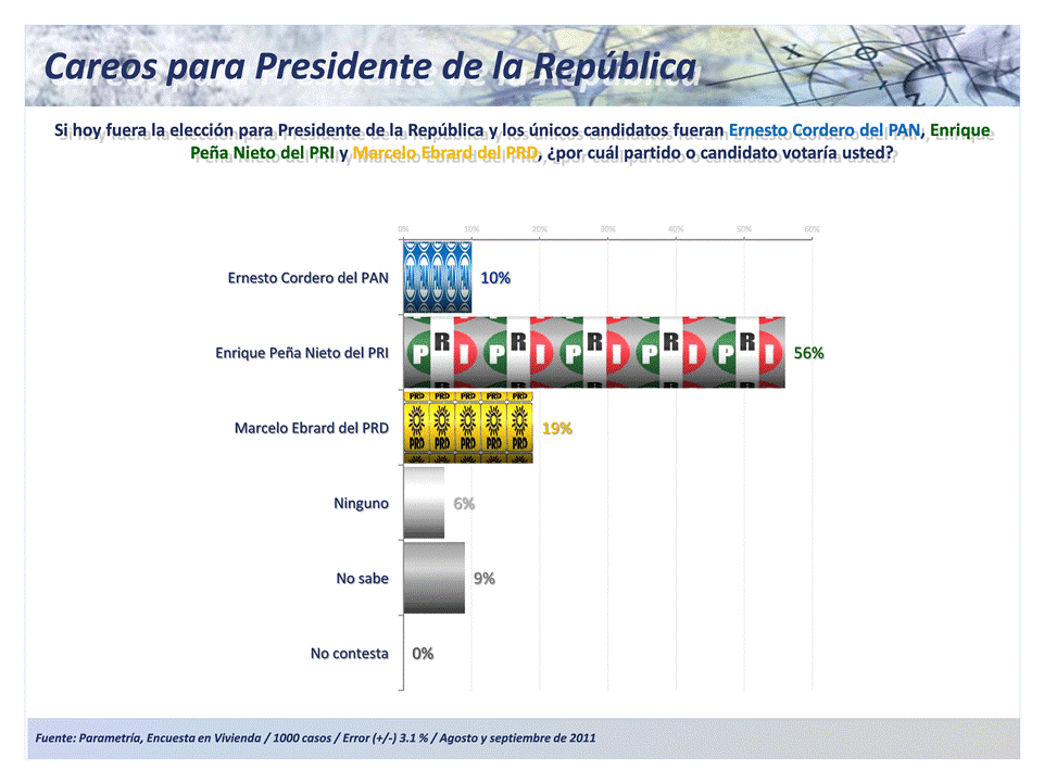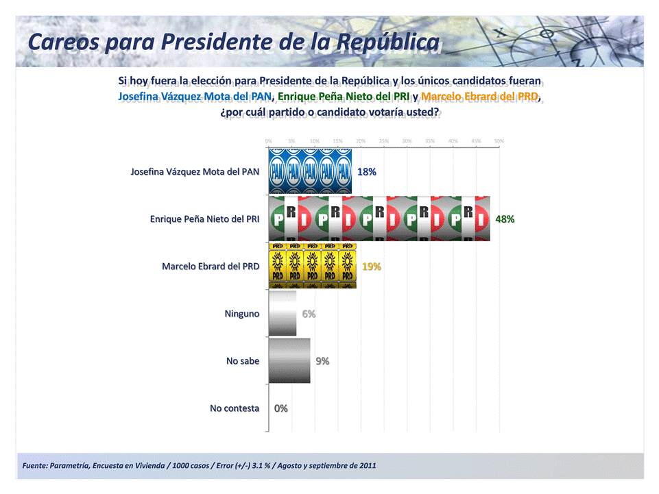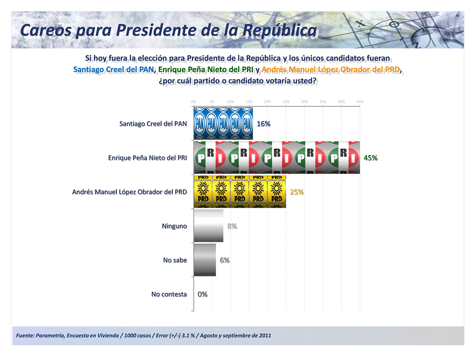 PARAMETRÍA. Estudio: Encuesta Nacional en vivienda. Representatividad: Nacional. Número de entrevistas: 1000 encuestas agosto y septiembre de 2011. Nivel de confianza estadística: 95%. Margen de error (+/-) 3.1%. Diseño, muestreo, operativo de campo y análisis: Parametría SA de CV. Método de muestreo: Aleatorio sistemático con probabilidad proporcional al tamaño.Unidad de muestreo: Las secciones electorales reportadas por el IFE.