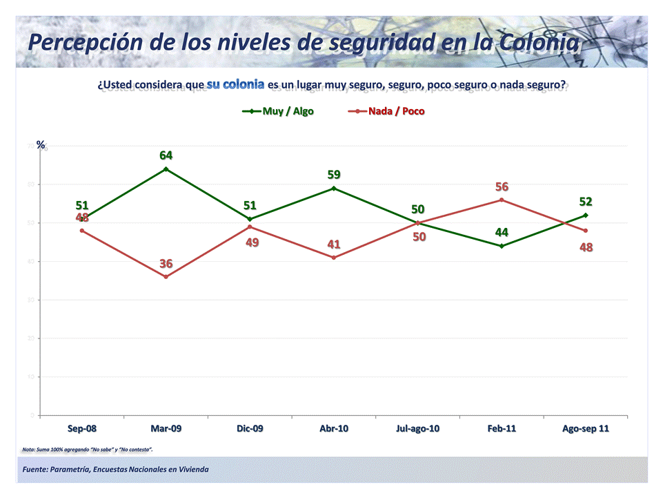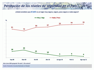 De septiembre de 2008 a la fecha, la mayoría de las personas (en porcentajes no menores al 76%) creen que el país es poco o nada seguro, con una tendencia a la alza que en la medición correspondiente a agosto y septiembre de 2011 llegó al 95%.
