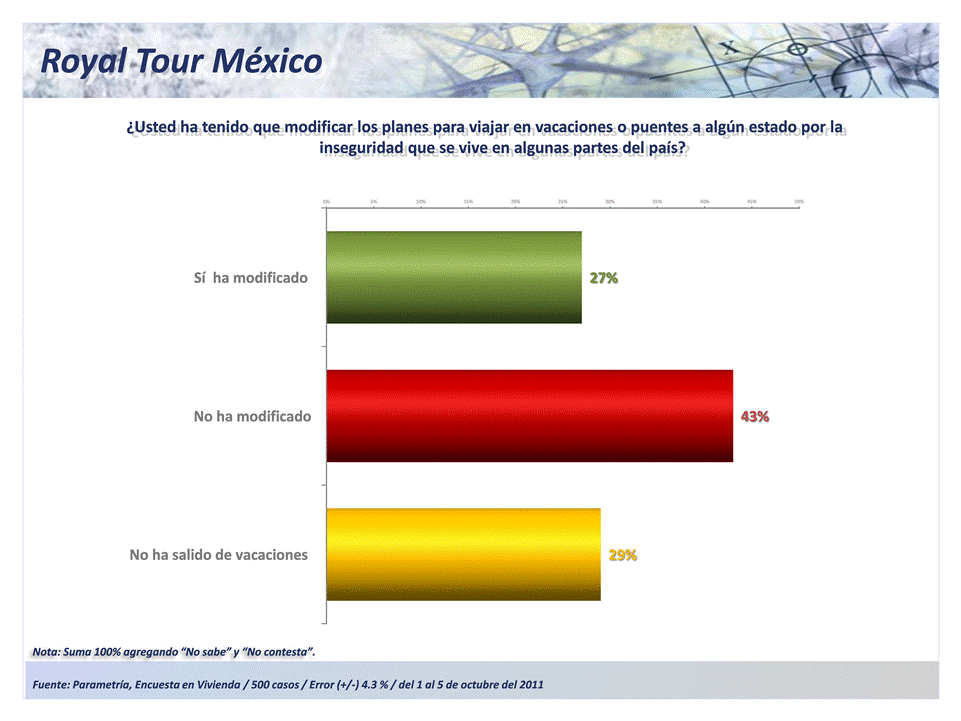 Lo anterior puede confirmarse cuando se cuestiona sobre la influencia de la violencia en los planes vacacionales de los mexicanos. Aunque significativo, menos de un tercio de la población (27%), ha modificado sus planes vacacionales, contra el 43% que no lo ha hecho. Relevante resulta que tres de cada diez encuestados declara no haber salido de vacaciones.