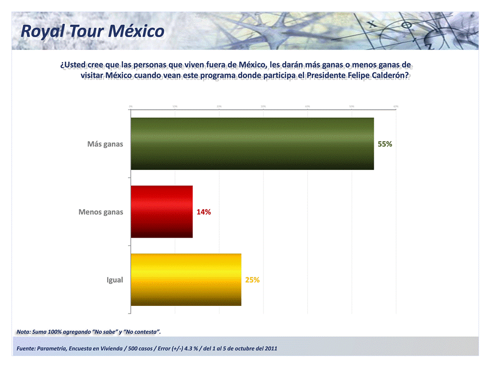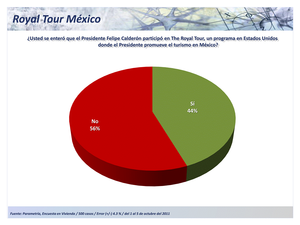Parametría investigó también los efectos de la participación del Presidente Felipe Calderón en el programa The Royal Tour, en el que el Mandatario promocionó al país como destino turístico.