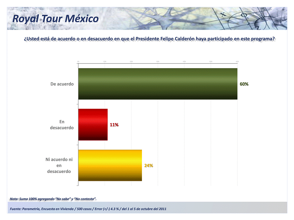 PARAMETRÍA. Estudio: Encuesta Nacional en vivienda. Representatividad: Nacional. Número de entrevistas: 500 encuestas del 1 al 5 de octubre de 2011. Nivel de confianza estadística: 95%. Margen de error (+/-) 4.3%. Diseño, muestreo, operativo de campo y análisis: Parametría SA de CV. Método de muestreo: Aleatorio sistemático con probabilidad proporcional al tamaño.Unidad de muestreo: Las secciones electorales reportadas por el IFE.