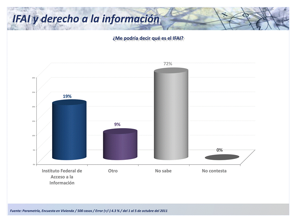 Sin embargo, los resultados de la más reciente encuesta de Parametría muestran que es una institución desconocida para la mayoría de los mexicanos. Siete de cada diez no saben qué es el IFAI, sólo 19% la identificó, y 9% la confundió con otra dependencia.