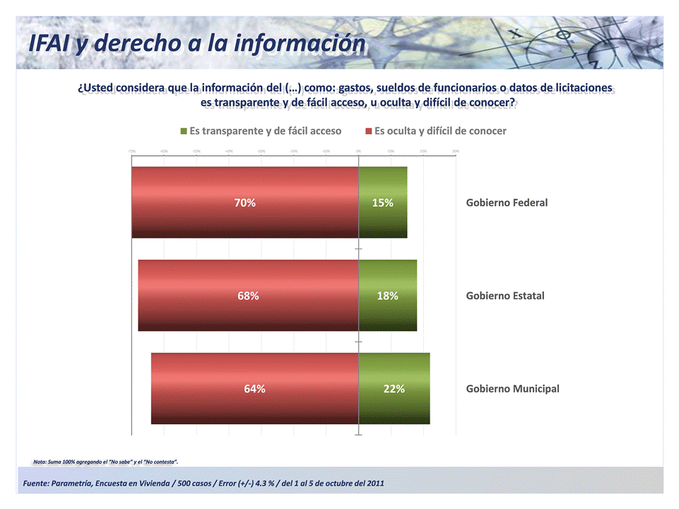 La mayoría de mexicanos considera que información que debe ser pública como: gastos, sueldos de funcionarios y licitaciones no es transparente ni de fácil acceso en los tres niveles de gobierno: federal, local y municipal. Resulta relevante que los mexicanos perciben menos transparencia en el gobierno federal que en los estatales o municipales. Así, 70% de ciudadanos cree que a nivel federal la información pública es difícil de conocer, en el caso de los gobiernos estatales el porcentaje baja al 68% y para los gobiernos municipales disminuye aún más, al 64%.