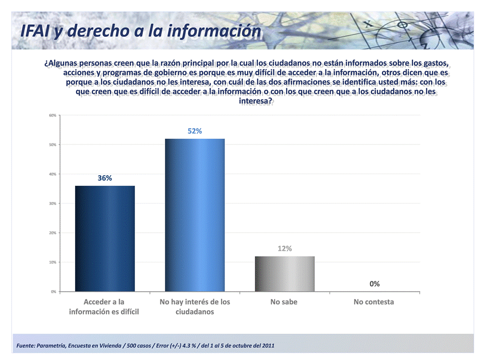 PARAMETRÍA. Estudio: Encuesta Nacional en vivienda. Representatividad: Nacional. Número de entrevistas: 500 casos, del 01 al 05 de octubre del 2011. Nivel de confianza estadística: 95%. Margen de error (+/-) 4.3%. Diseño, muestreo, operativo de campo y análisis: Parametría SA de CV. Método de muestreo: Aleatorio sistemático con probabilidad proporcional al tamaño. Unidad de muestreo: Las secciones electorales reportadas por el IFE.