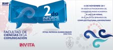 Sirva el presente para invitarlos al Segundo Informe, segunda gestión, de nuestra Directora, Mtra. Patricia Durán Bravo. La cita es el miércoles 16 de noviembre a las 11:00 hrs., salón de seminarios del Complejo Cultural Universitario.