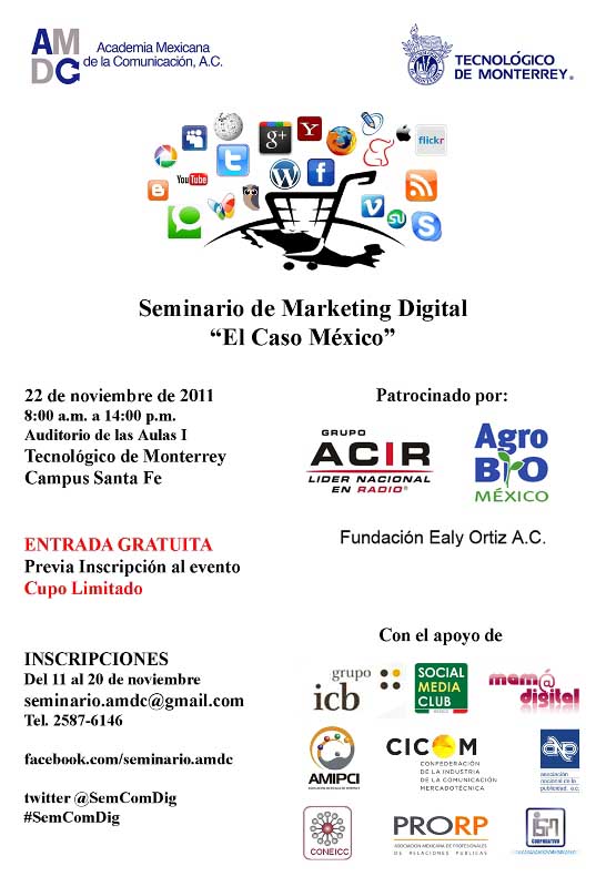 La Academia Mexicana de la Comunicación y el Tecnológico de Monterrey campus Santa Fe te invitan al Tercer Seminario de Marketing Digital «El caso Mexico» que se llevará a cabo el martes 22 de noviembre de 2011, de las 08:00 a las 14:00 horas en el Auditorio de las Aulas 1 del TEC Santa Fe.