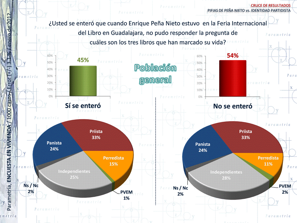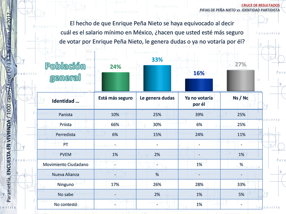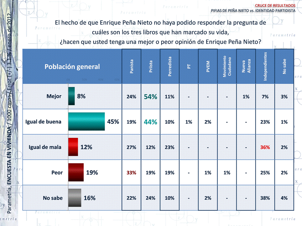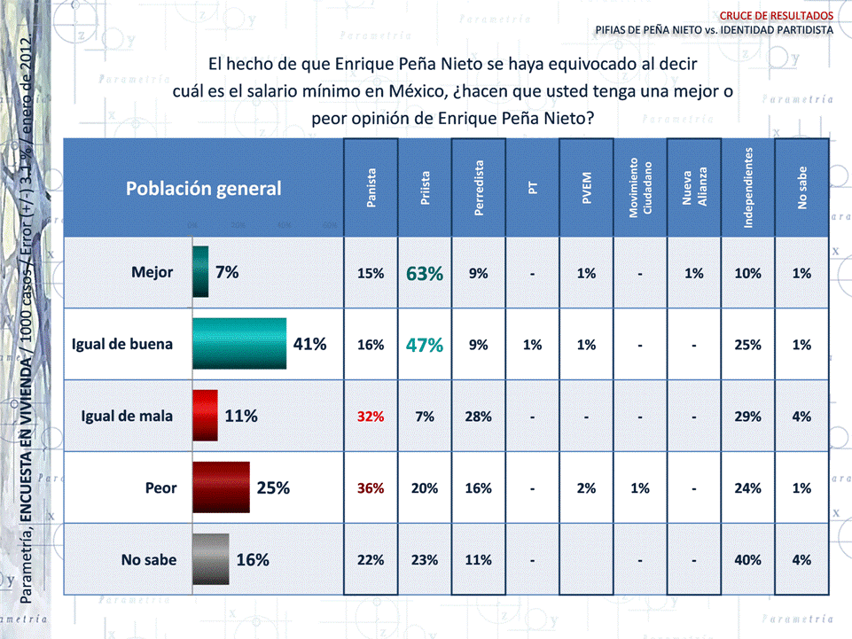 PARAMETRÍA. Encuesta Nacional en Vivienda. Representatividad: Nacional. Número de entrevistas: 1000 encuestas del 2 al 6 de enero de 2012. Nivel de confianza estadística: 95%. Margen de error: (+/-) 3.1%. Diseño, muestreo, operativo de campo y análisis: Parametría SA de CV. Método de muestreo: Aleatorio sistemático con probabilidad proporcional al tamaño. Unidad de muestreo: Las secciones electorales reportadas por el IFE.
