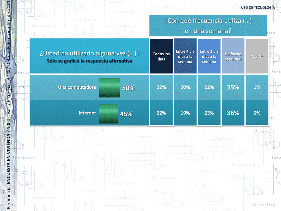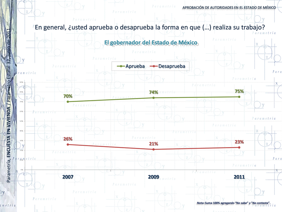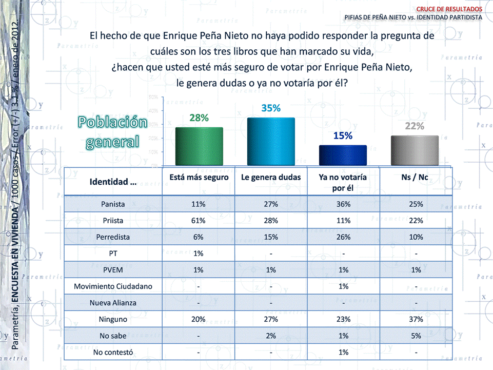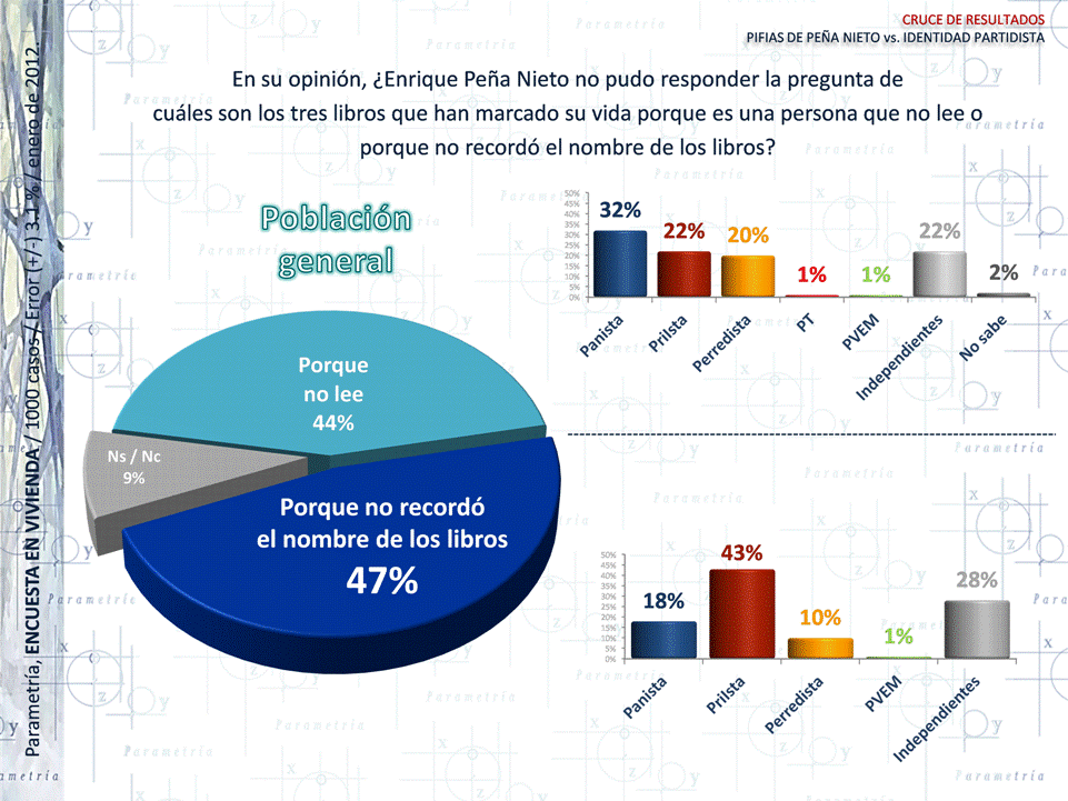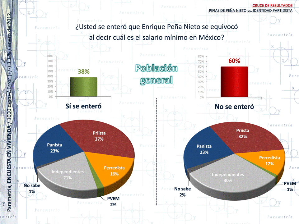 PARAMETRÍA. Encuesta Nacional en Vivienda. Representatividad: Nacional. Número de entrevistas: 1000 encuestas del 2 al 6 de enero de 2012. Nivel de confianza estadística: 95%. Margen de error: (+/-) 3.1%. Diseño, muestreo, operativo de campo y análisis: Parametría SA de CV. Método de muestreo: Aleatorio sistemático con probabilidad proporcional al tamaño. Unidad de muestreo: Las secciones electorales reportadas por el IFE.