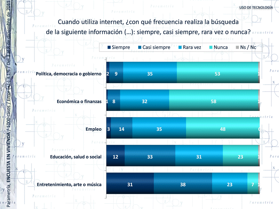 Segunda razón: uso de internet. Poco más de la mitad (53%) de los encuestados en diciembre de 2011 declaró que nunca realizaba búsquedas de política, democracia o gobierno; mientras que seis de cada diez (68%), tampoco se interesaban en buscar información económica o de finanzas. Las búsquedas más populares y constantes en internet son de entretenimiento, arte o música.