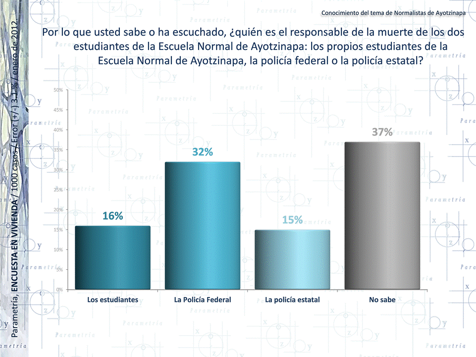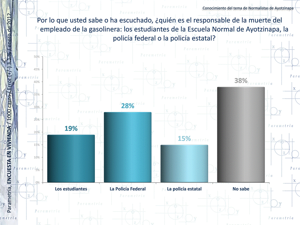 La más reciente Encuesta Nacional en Vivienda de Parametría muestra que 43% de los encuestados mencionó que los policías fueron los responsables de la muerte de Gonzalo Miguel Rivas Cámara, empleado de una gasolinera cercana al enfrentamiento. La culpa se la reparten dos corporaciones, 28% para la Policía Federal y 15% para la policía estatal de Guerrero.