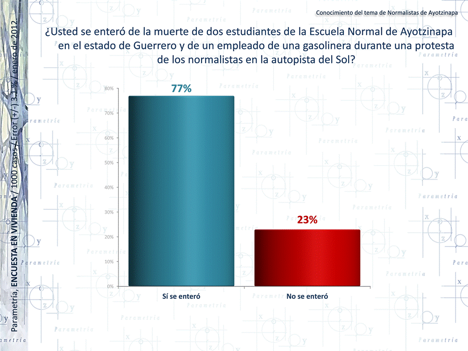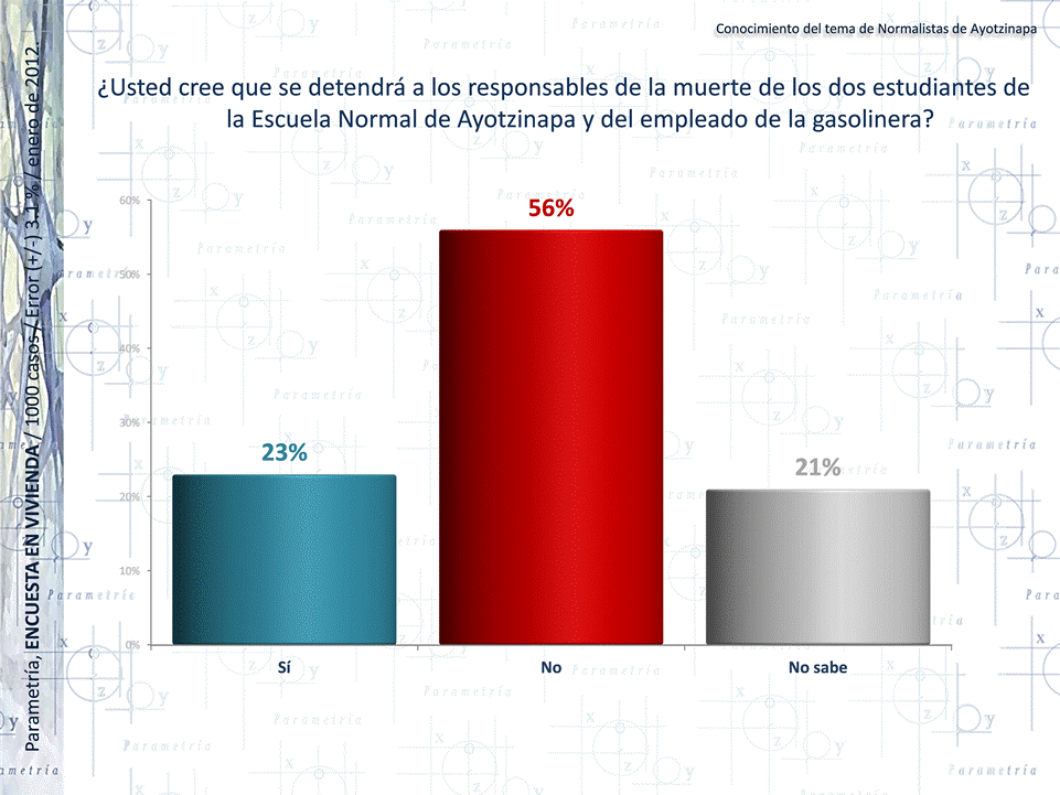PARAMETRÍA.Encuesta Nacional en vivienda. Representatividad: Nacional. Número de entrevistas: 1000 entrevistas, en enero de 2012. Nivel de confianza estadística: 95%. Margen de error: (+/-) 3.1%. Diseño, muestreo, operativo de campo y análisis: Parametría SA de CV. Método de muestreo: Aleatorio sistemático con probabilidad proporcional al tamaño. Unidad de muestreo: Las secciones electorales reportadas por el IFE.