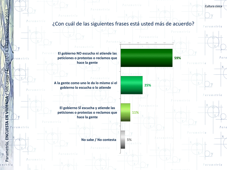 A propósito del evento, Parametría ofrece un repaso a la posición de los mexicanos sobre métodos de protesta. Hacia noviembre de 2011, seis de cada diez mexicanos consideraba que el gobierno no escucha ni atiende las peticiones de la gente, únicamente el 11% pensaba que el gobierno sí atendía demandas de la población.