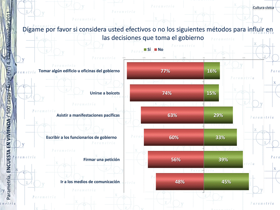 Con 45%, la asistencia a los medios de comunicación es, de acuerdo con los encuestados, el método más efectivo para influir en las decisiones que toma el gobierno. En contraste, la toma de oficinas de gobierno y la unión a boicots son consideradas como las menos efectivas, con 77% y 74%, respectivamente, de personas que no creen en la efectividad.