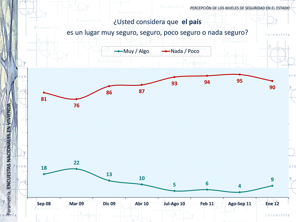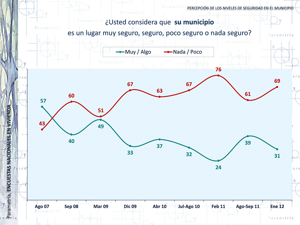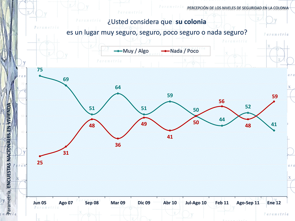 Hacia junio de 2005, cuando inició la medición, 75% de los mexicanos creían que su colonia era en alguna medida segura. A partir de esa fecha, los niveles de percepción de seguridad han caído constantemente, primero al 69% en agosto de 2007 (ya iniciada la estrategia del Presidente Felipe Calderón de combate al narcotráfico), y