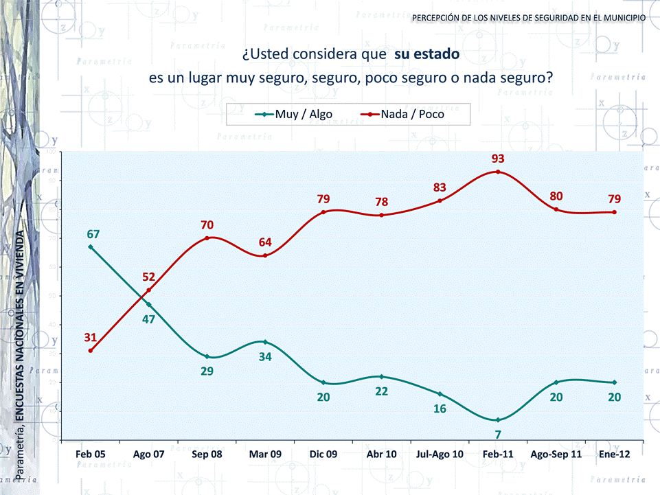 Aunque se trata de una cifra alta, no es la cumbre en la serie de Parametría. Fue en la medición correspondiente a agosto de 2011 en la que más mexicanos dijeron que su estado era poco o nada seguro, con 93% que así respondió.