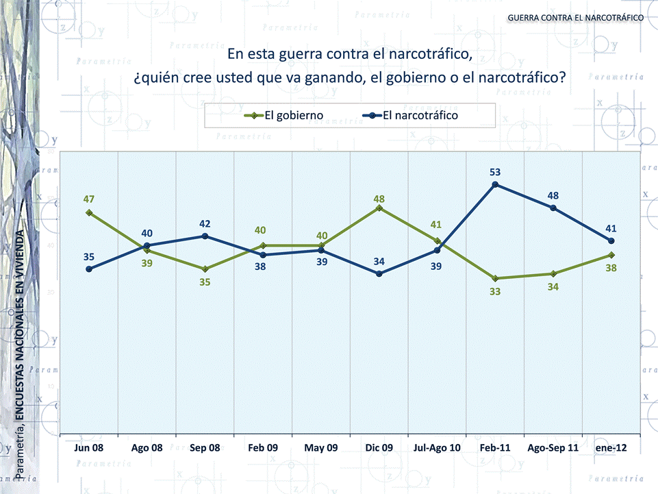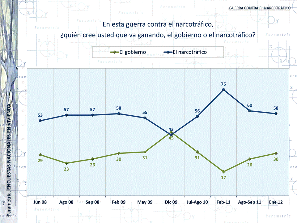 Cabe mencionar que en 11 meses (febrero 2011 a enero 2012), disminuyó 17 puntos la posición que cree que el narco va ganando, mientras que aumentó en 13 puntos el porcentaje que cree que es el gobierno el que lleva la delantera en el enfrentamiento.