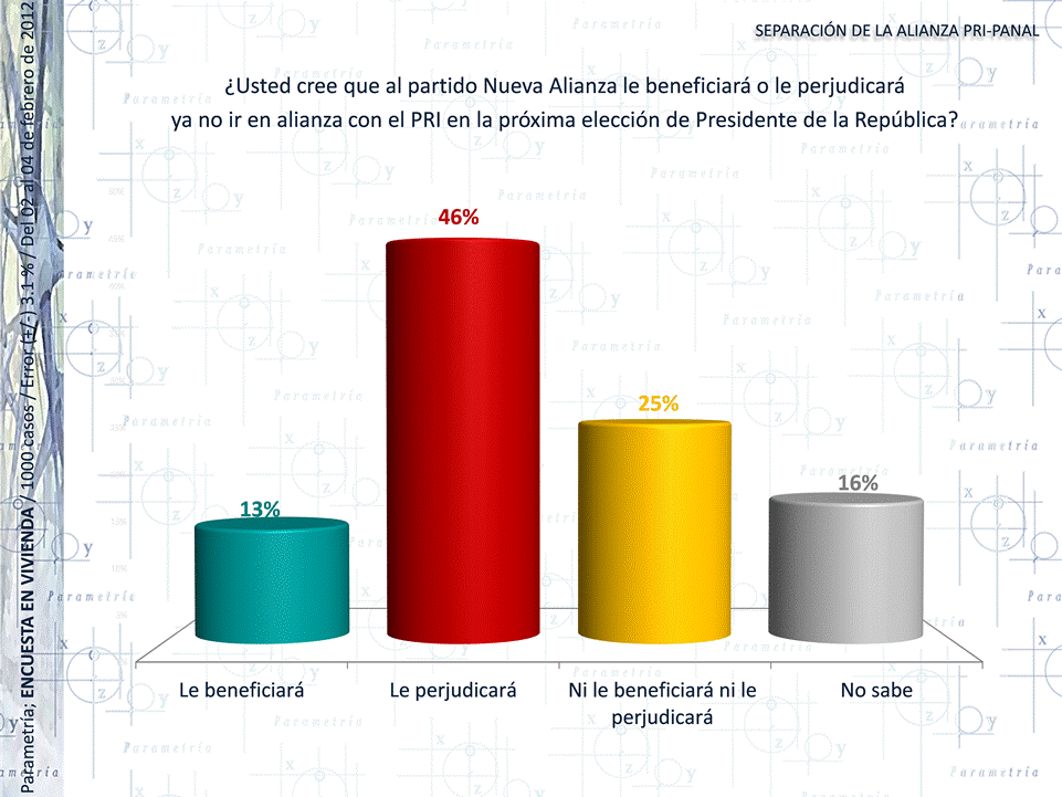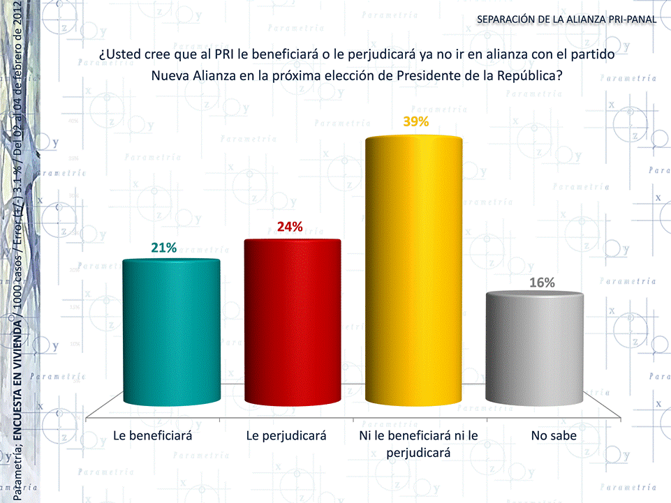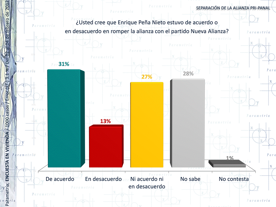PARAMETRÍA. Estudio: Encuesta Nacional en vivienda. Representatividad: Nacional. Número de entrevistas: 1000 encuestas. Del 02 al 04 de febrero de 2012. Nivel de confianza estadística: 95%. Margen de error (+/-) 3.1%. Diseño, muestreo, operativo de campo y análisis: Parametría SA de CV. Método de muestreo: Aleatorio sistemático con probabilidad proporcional al tamaño. Unidad de muestreo: Las secciones electorales reportadas por el IFE.