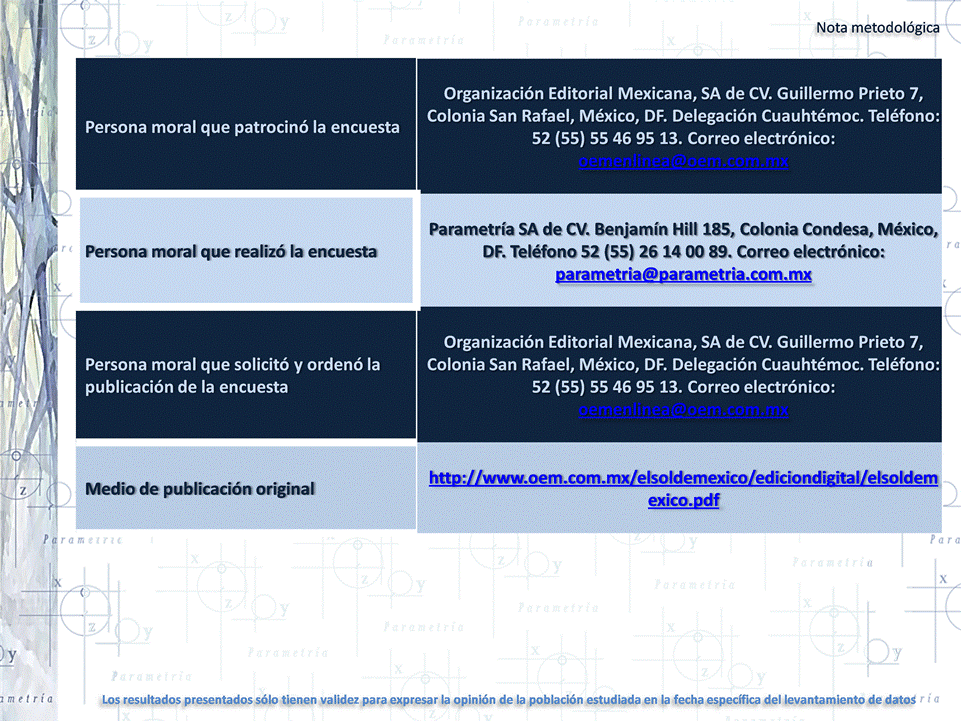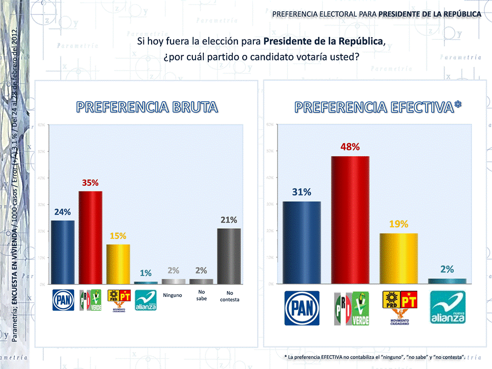 PARAMETRÍA. Encuesta Nacional en vivienda. Representatividad: Nacional. Número de entrevistas: 1000 encuestas del 24 al 28 de febrero de 2012. Nivel de confianza estadística: 95%. Margen de error: (+/-) 3.1%. Diseño, muestreo, operativo de campo y análisis: Parametría SA de CV. Método de muestreo: Aleatorio sistemático con probabilidad proporcional al tamaño. Unidad de muestreo: Las secciones electorales reportadas por el IFE.