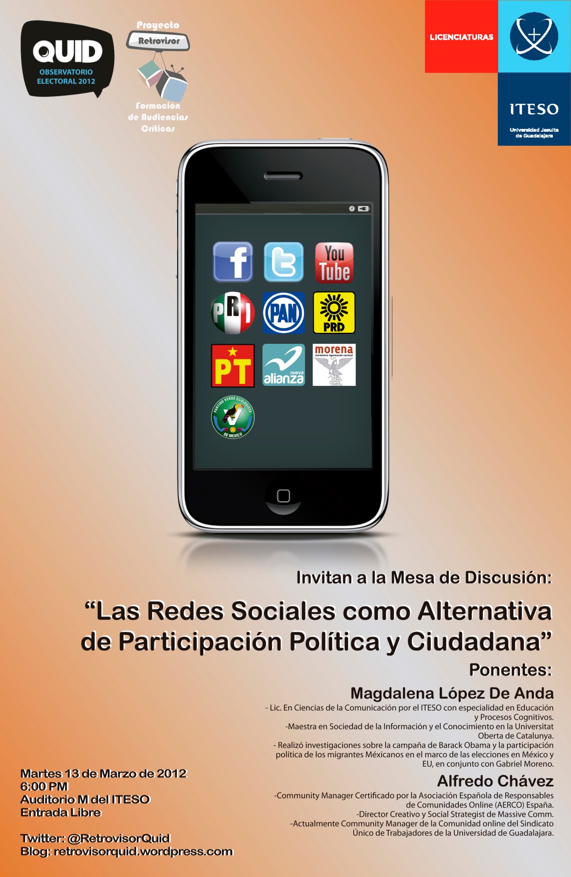 En esta ocasión presentaremos el proyecto de observación del uso de las redes sociales por parte de los candidatos al gobierno de Jalisco. La presentación de los resultados correrá a cargo de Mariana Esquinca Verea, una de las cuatro personas que integran este equipo de investigación. Para comentar los resultados estará la María Magdalena López de Anda, académica del ITESO y experta en temas de educación y nuevas tecnologías, así como Alfredo Chávez, especialista en comunicación y comunidades virtuales.