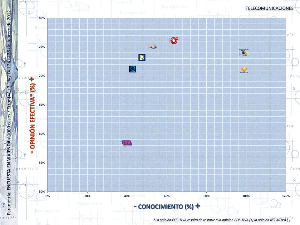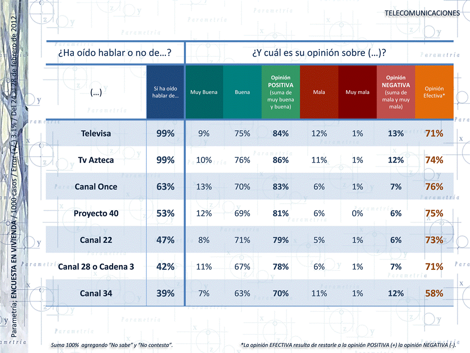 PARAMETRÍA. Encuesta Nacional en vivienda. Representatividad: Nacional. Número de entrevistas: 1000 encuestas del 24 al 28 de febrero de 2012. Nivel de confianza estadística: 95%. Margen de error: (+/-) 3.1%. Diseño, muestreo, operativo de campo y análisis: Parametría SA de CV. Método de muestreo: Aleatorio sistemático con probabilidad proporcional al tamaño. Unidad de muestreo: Las secciones electorales reportadas por el IFE.