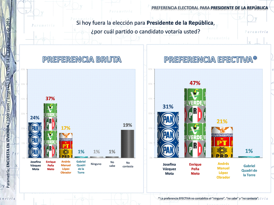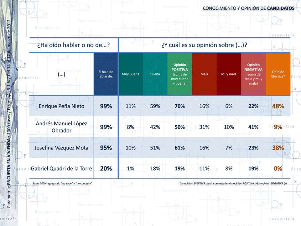 PARAMETRÍA. Encuesta Nacional en vivienda. Representatividad: Nacional. Número de entrevistas: 1000 encuestas del 14 al 17 de marzo de 2012. Nivel de confianza estadística: 95%. Margen de error: (+/-) 3.1%. Diseño, muestreo, operativo de campo y análisis: Parametría SA de CV. Método de muestreo: Aleatorio sistemático con probabilidad proporcional al tamaño. Unidad de muestreo: Las secciones electorales reportadas por el IFE.