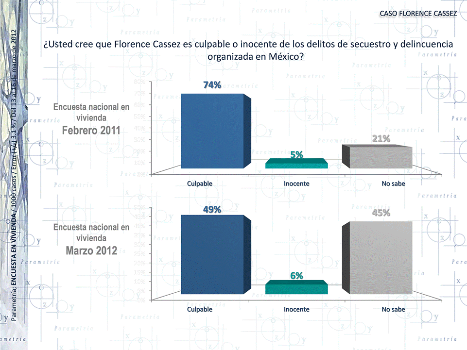 De acuerdo con la medición, se puede observar que en 13 meses disminuyó 25 puntos la postura que cree culpable a Cassez. En el mismo lapso, aumentaron las dudas sobre la culpabilidad de la francesa, al pasar de 21% a 45% el porcentaje de los que no saben si la francesa es culpable o inocente de los delitos de secuestro y delincuencia organizada.