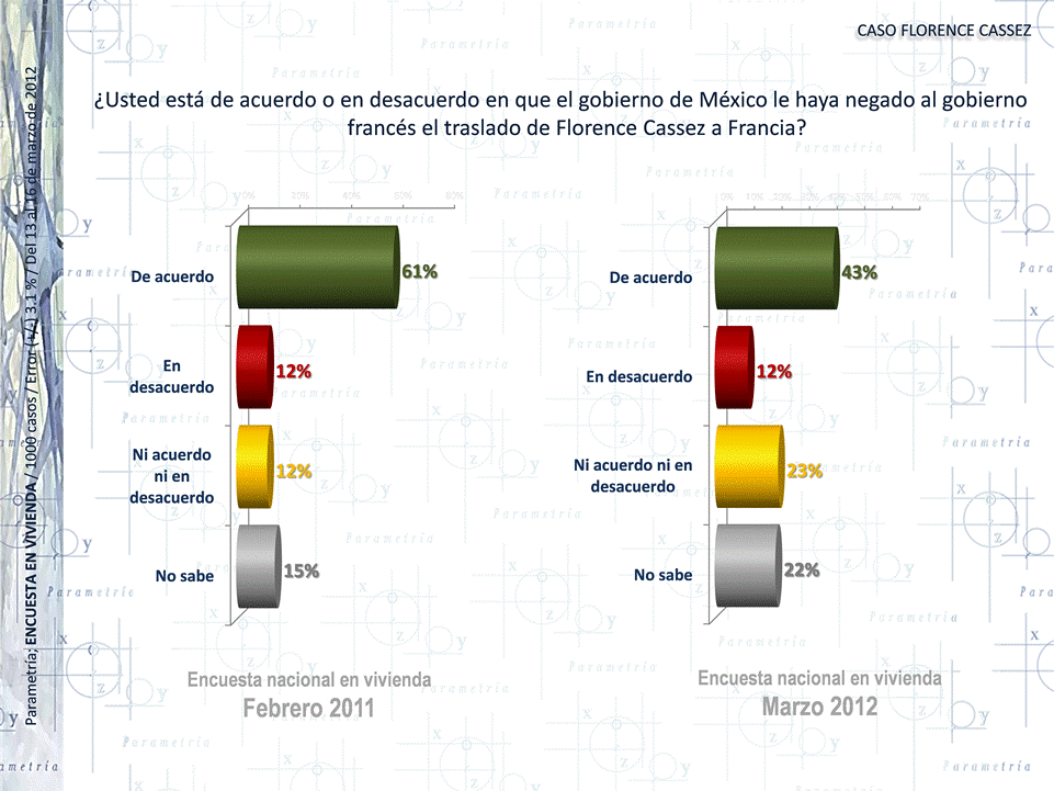 Del 61% que estaba de acuerdo en febrero de 2011, ahora sólo el 43% apoya la decisión del gobierno mexicano, 23% no está ni a favor ni en contra de la postura de México y un 12% se manifiesta en contra.