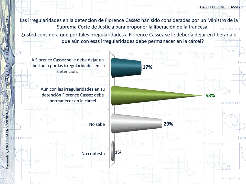 PARAMETRÍA. Encuesta Nacional en vivienda. Representatividad: Nacional. Número de entrevistas: 1000 encuestas del 13 al 16 de marzo de 2012. Nivel de confianza estadística: 95%. Margen de error: (+/-) 3.1%. Diseño, muestreo, operativo de campo y análisis: Parametría SA de CV. Método de muestreo: Aleatorio sistemático con probabilidad proporcional al tamaño. Unidad de muestreo: Las secciones electorales reportadas por el IFE.