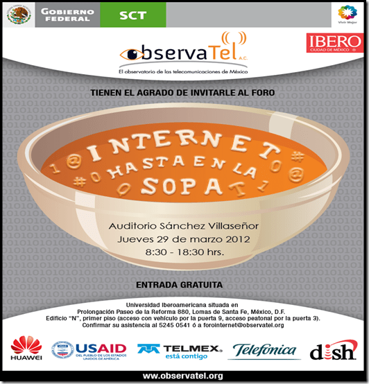 Los invito a que nos acompañen al Foro “Internet hasta en la SOPA”, organizado conjuntamente por la Secretaría de Comunicaciones y Transportes, la Universidad Iberoamericana y Observatel. Ojalá nos ayuden a difundirlo.