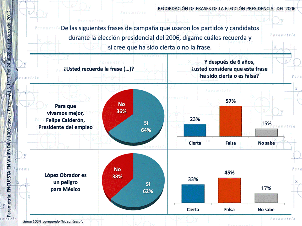 64% de los mexicanos recuerdan la frase: “Para que vivamos mejor, Felipe Calderón, Presidente del empleo”, con la que se promocionó el entonces aspirante a la Primera Magistratura.