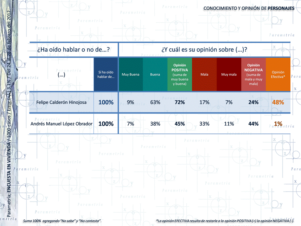 Calderón tiene una opinión efectiva de 48%, frente a López Obrador quien suma apenas 1% en el mismo rubro (que muestra el saldo entre opinión efectiva y positiva).