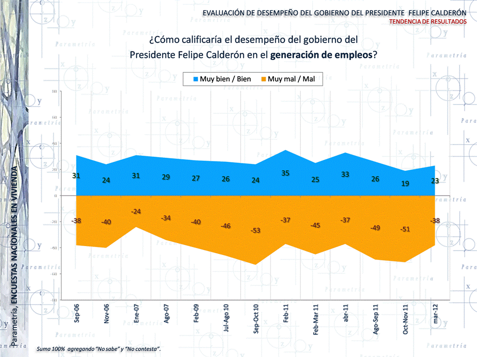 La percepción mayoritaria que ve falsa la promoción de Calderón como Presidente del empleo es consistente con la evaluación que recibe el Mandatario de su trabajo en la generación de empleo.