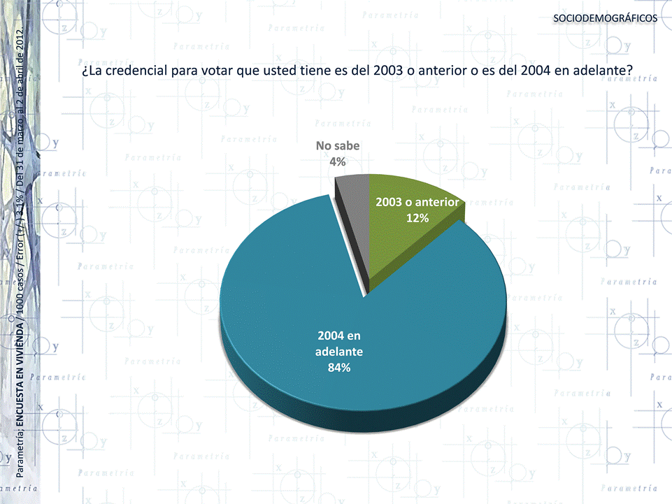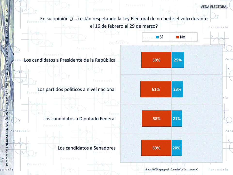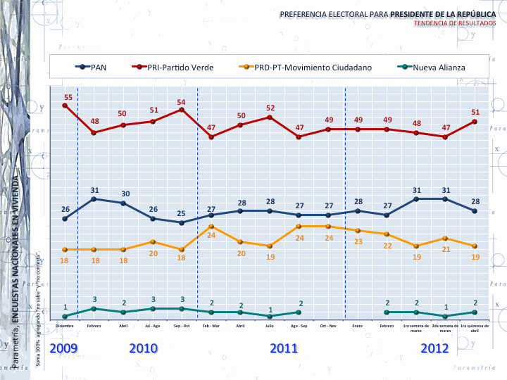 PARAMETRÍA. Encuesta Nacional en vivienda. Representatividad: Nacional. Número de entrevistas: 1000 encuestas del 31 de marzo al 02 de abril de 2012. Nivel de confianza estadística: 95%. Margen de error: (+/-) 3.1%. Diseño, muestreo, operativo de campo y análisis: Parametría SA de CV. Método de muestreo: Aleatorio sistemático con probabilidad proporcional al tamaño. Unidad de muestreo: Las secciones electorales reportadas por el IFE. Población objetivo: Mayores de 18 años con credencial para votar que al momento de la entrevista resida en el lugar de interés.