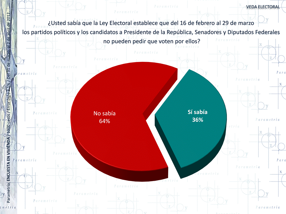 La veda electoral, concluida el 29 de marzo, pasó desapercibida para la mayoría de los mexicanos. El 64% de los electores no estaba enterado que del 16 de febrero al 29 de marzo, los partidos y candidatos a Presidente de la República, Senadores y Diputados Federales la ley electoral no les permitía pedir el voto a los ciudadanos. Sólo el 36% de la población conocía la disposición.