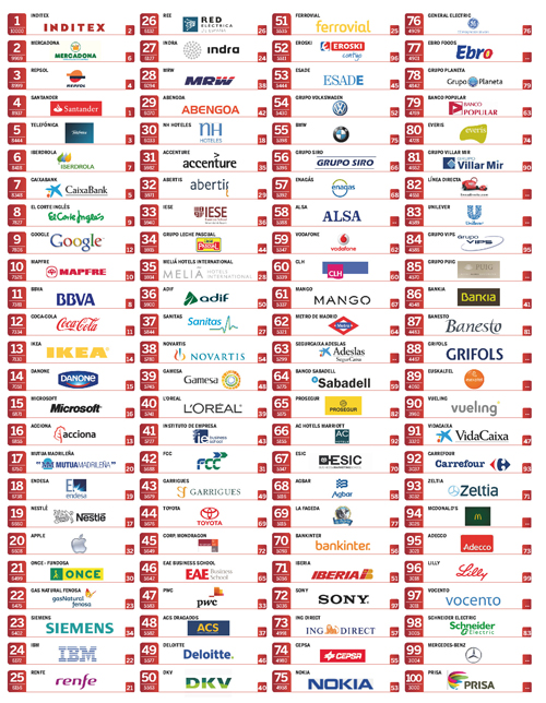 La tres primeras empresas con mejor reputación, que se llevan el galardón, son Inditex, Mercadona y Repsol. En cuarto puesto se encuentra el Banco Santader y en quinto Telefónica.