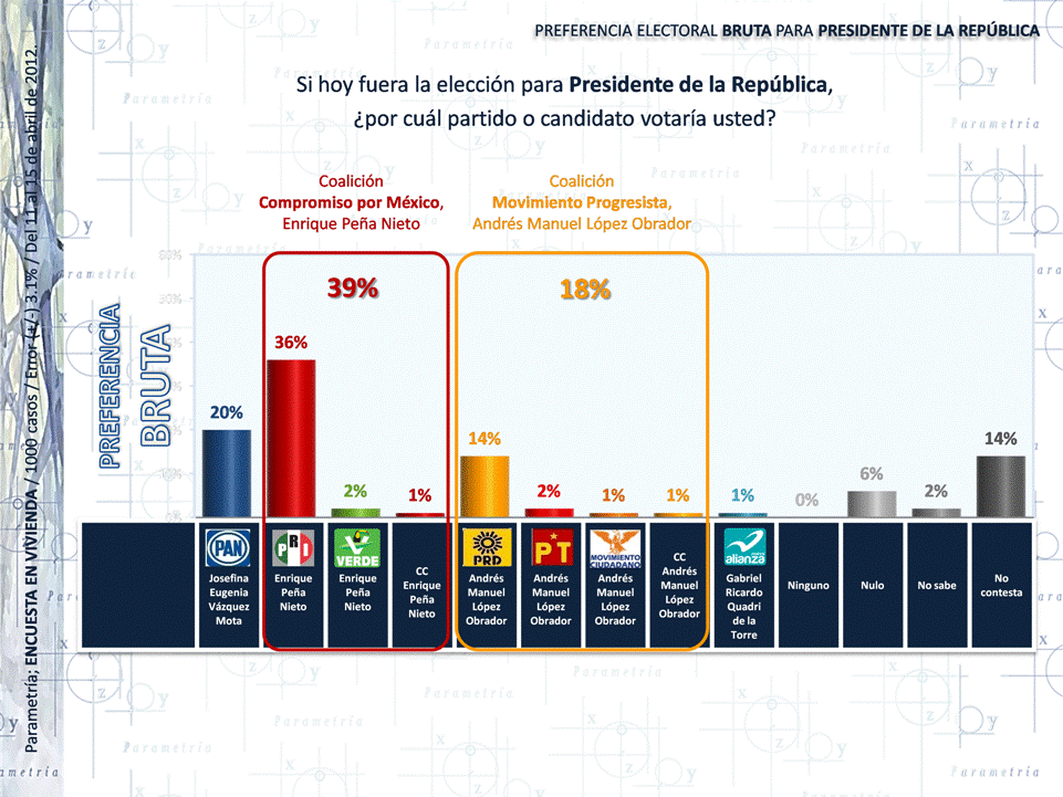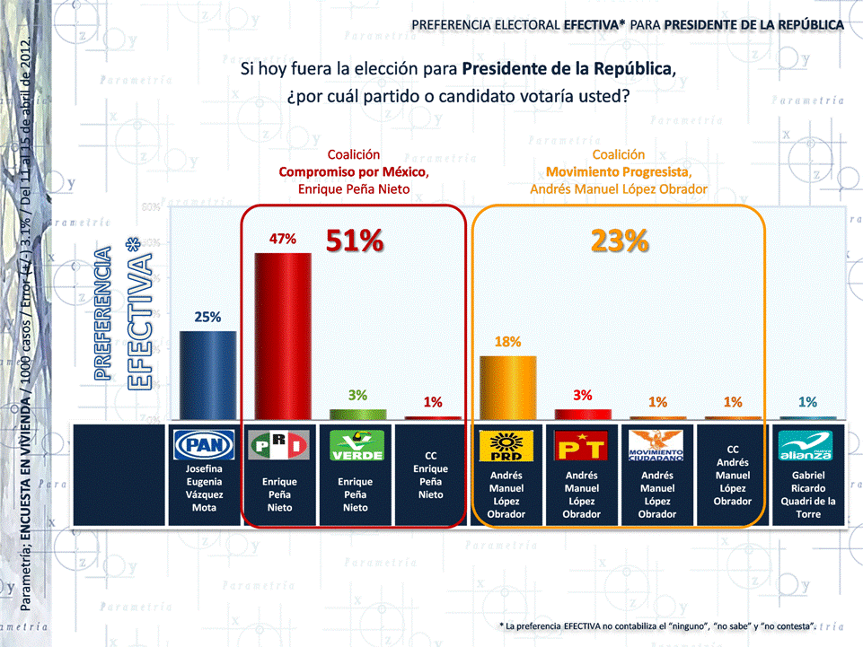 La preferencia por la coalición de las izquierdas creció 4 puntos, de 19% a 23%; mientras que el PAN bajó 3 puntos, al pasar de 28% a 25%. También bajó la preferencia por Gabriel Quadri, candidato presidencial de Nueva Alianza quien se ubicó en 1%.