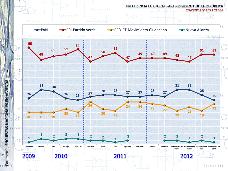 La más reciente Encuesta Nacional en Vivienda de Parametría muestra modificaciones en la preferencia electoral para Presidente de la República, en las que se aprecia que se acorta la diferencia entre el segundo y tercer lugar (PAN con Josefina Vázquez Mota y coalición PRD, PT, Movimiento Ciudadano con Andrés Manuel López Obrador, respectivamente), mientras que el primer lugar (con Enrique Peña Nieto como abanderado de la alianza PRI-PVEM), se mantiene en 51%.