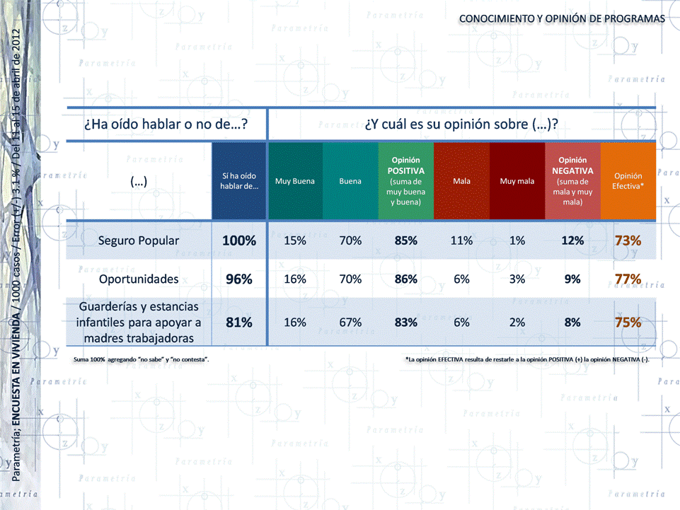 Estos programas gozan de altos niveles de opinión efectiva, todos arriba del 70%, siendo Oportunidades el que tiene mejor imagen entre los ciudadanos.