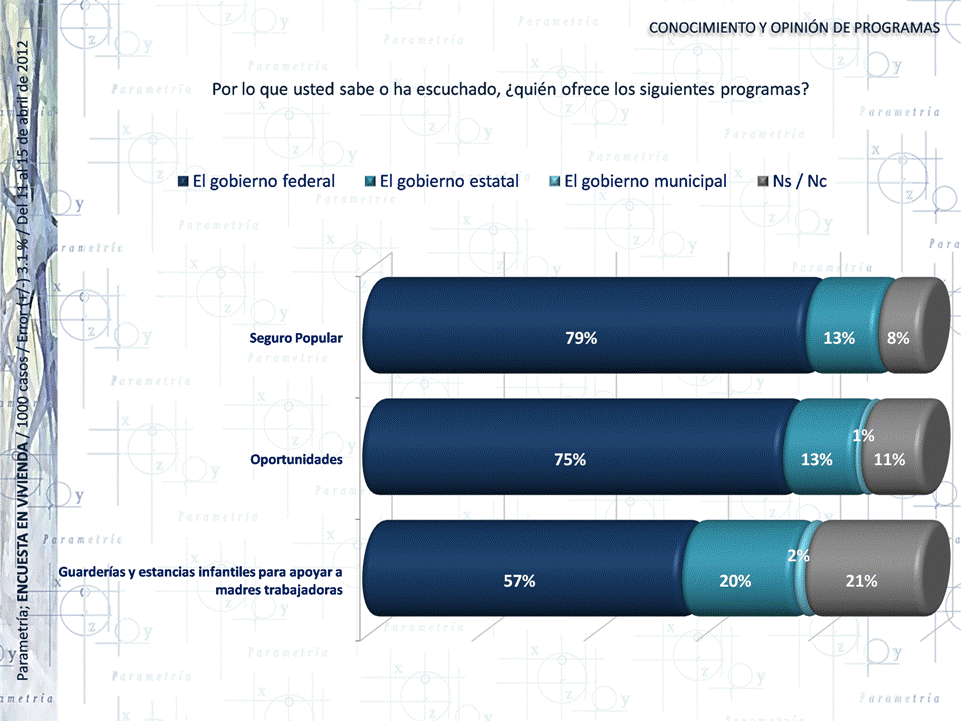 En el caso del Seguro Popular y de Oportunidades, ocho de cada diez ciudadanos saben que son programas de carácter federal, mientras que para las estancias infantiles el porcentaje baja a 57%, siendo el programa que más se adjudica a los gobiernos estatales.