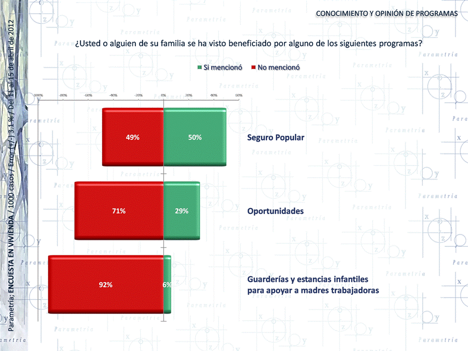 El Seguro Popular es el programa del que 50% de los entrevistados se ha beneficiado (personalmente o alguien de su familia). Le sigue Oportunidades, del que menos de un tercio se ha beneficiado y por último el de estancias infantiles, del que únicamente 6% ha visto provecho.