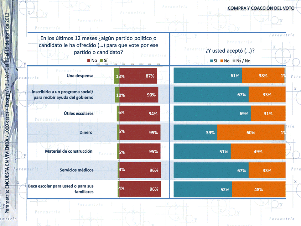 Uno de cada diez mexicanos (13%) dijo que algún candidato o partido político le había ofrecido una despensa para que votara por determinada opción. El porcentaje es similar a la oferta de inscripción en un programa social o para recibir ayuda del gobierno. Los números bajan para otras ofertas como útiles escolares, dinero, materiales de construcción o servicios médicos, sin que ninguna obtuviera menos del 4%.