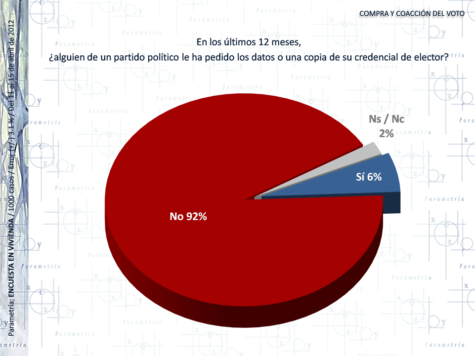 La recolección de datos de las credenciales electorales, fenómeno recurrente en el pasado, no ha sido, en lo que va de las campañas, recurrente, de acuerdo con los resultados. Apenas 6% de los entrevistados declara que alguien de un partido le ha solicitado datos o copia de la credencial del IFE.