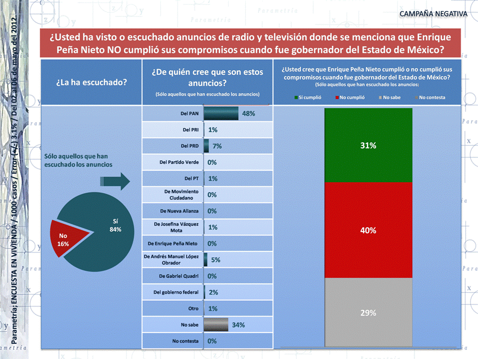Parametría evaluó en dos tiempos la campaña que para desprestigiar a Peña impulsó el PAN. De la tercera semana de abril a la primera de mayo aumentó 29 puntos el alcance del mensaje; hacia inicios de mayo sólo 16% de los mexicanos no había visto ni escuchado los anuncios.