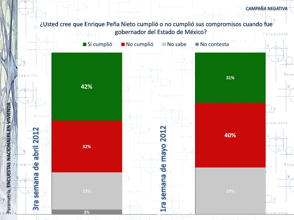 A la par del conocimiento aumentaron las dudas hacia la gestión de Peña como gobernador. En la primera medición, eran más (42% frente a 32%) quienes creían que el priista sí había realizado sus compromisos de campaña; para el segundo levantamiento se invirtieron los resultados, con 40% que no creía en el cumplimiento de los compromisos de Peña.